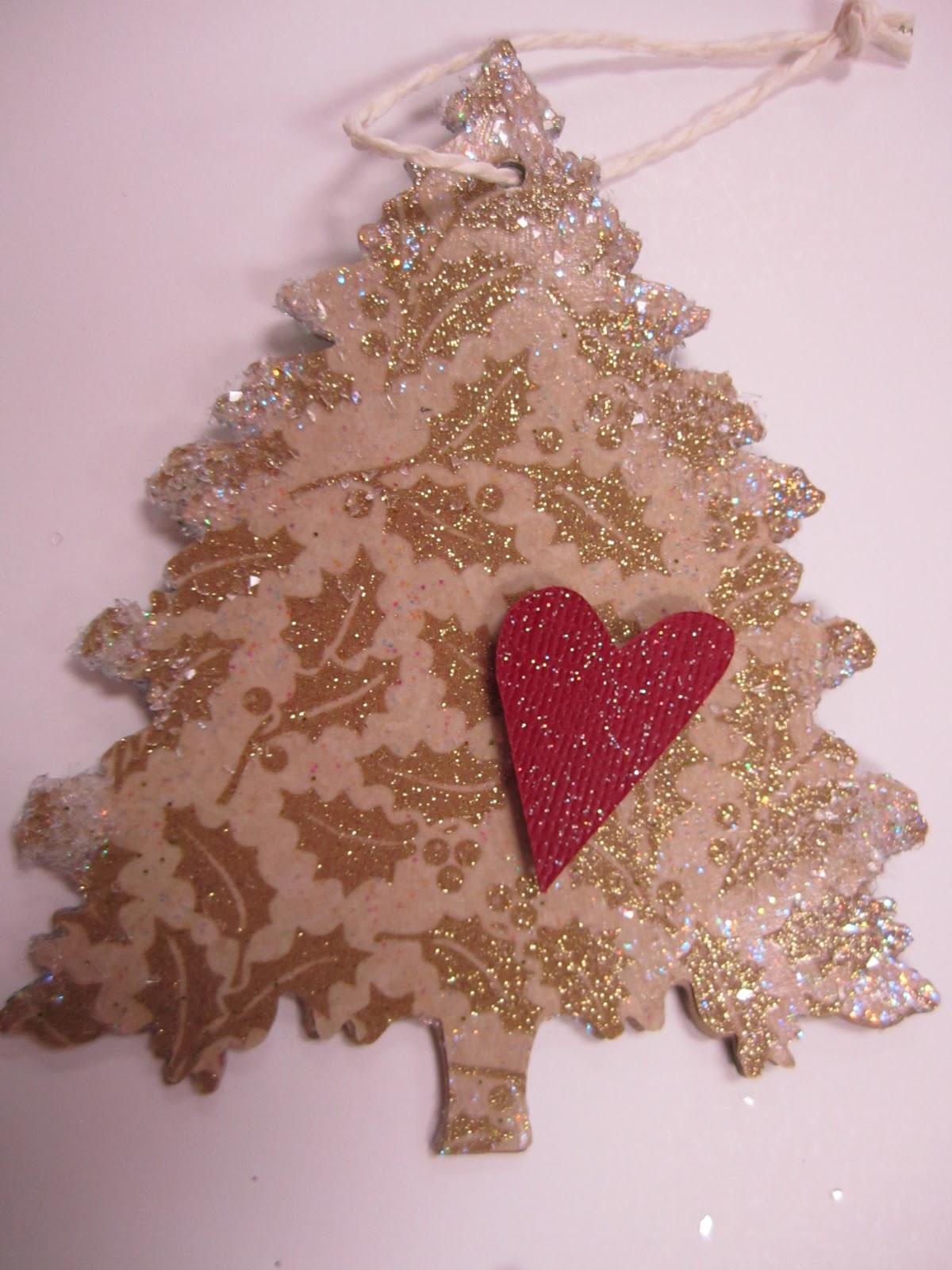 This tree was really fun to make, It is a sizzix cut, chipboard covered with pretty paper, the covered with glittered modge-podge. I then dipped the edges in modge-podge and then into diamond dust. Added a little pop out heart and this turned into a really pretty decoration. I made more for the MB tree that are shown below.